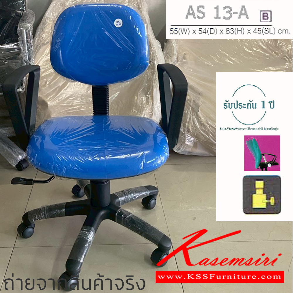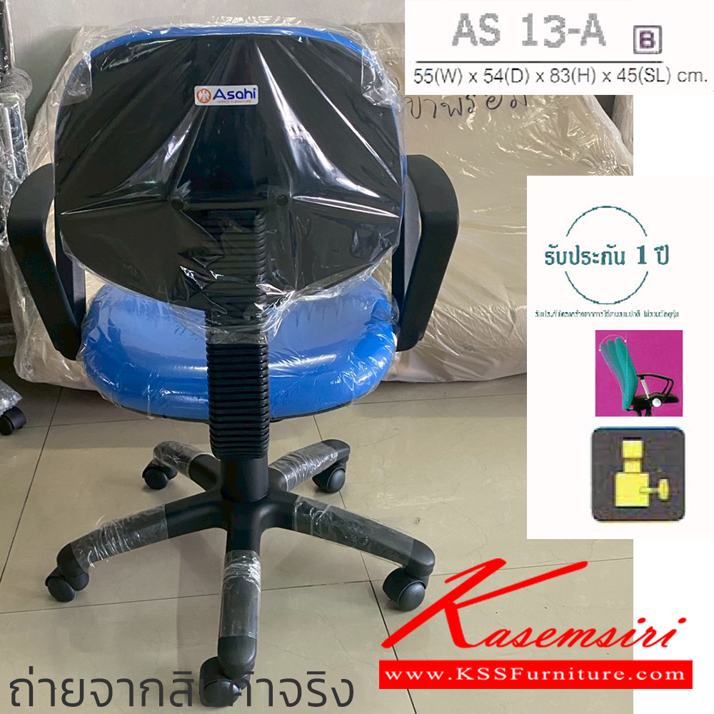 An Asahi AS-13A series office chair with backrest tilting mechanism and fiber base, providing adjustable locked-screw extension. 3-year warranty for the frame of a chair under normal application and 1-year warranty for the plastic base and accessories. Dimension (WxDxH) cm : 60x54x83. Available in 3 seat styles: PVC leather, PU leather and Cotton.