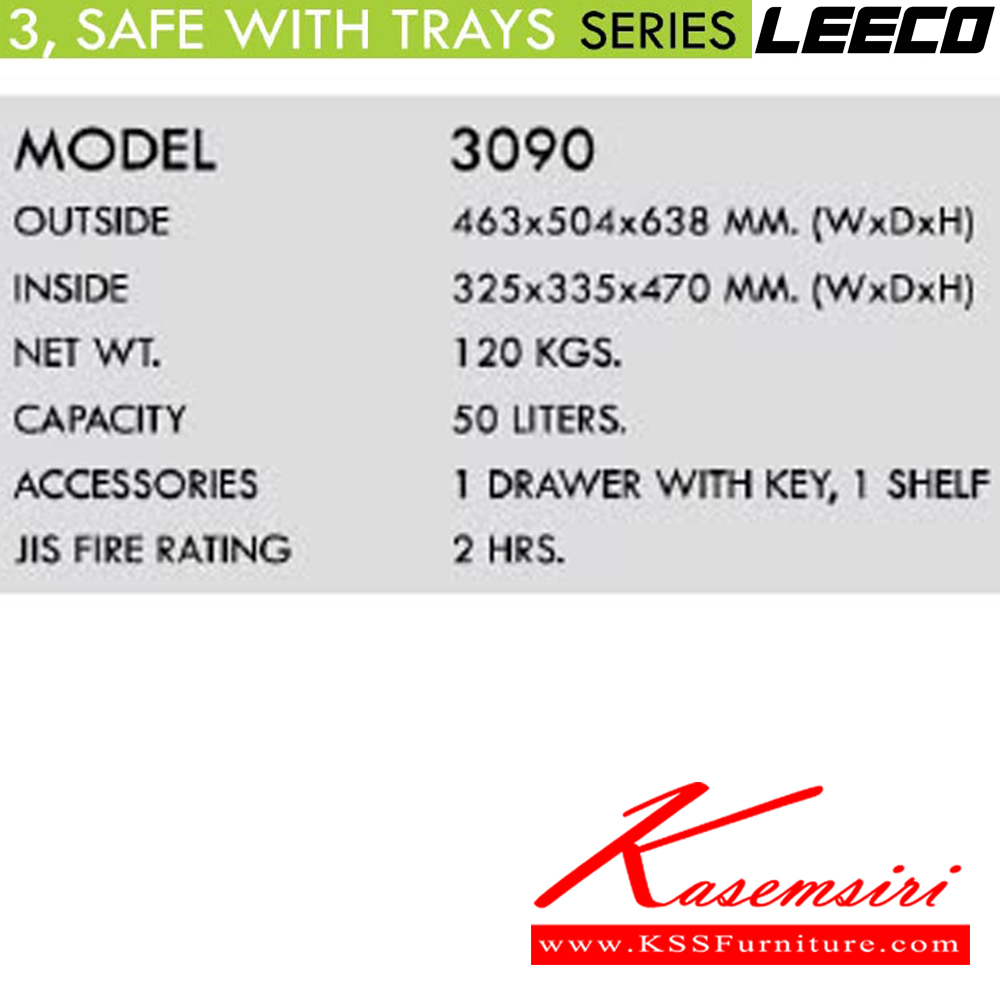 น้ำหนัก 120 kg. ขนาดภายนอก 463x504x638 มม. ขนาดภายใน 325x335x470 มม. ความจุ 50 liters ทนไฟได้ 2 hrs. ตู้เซฟ Leeco