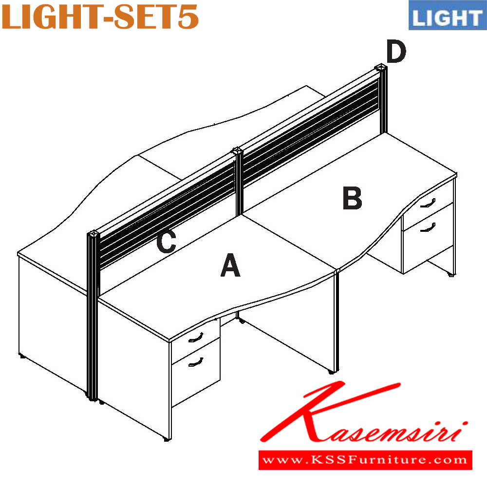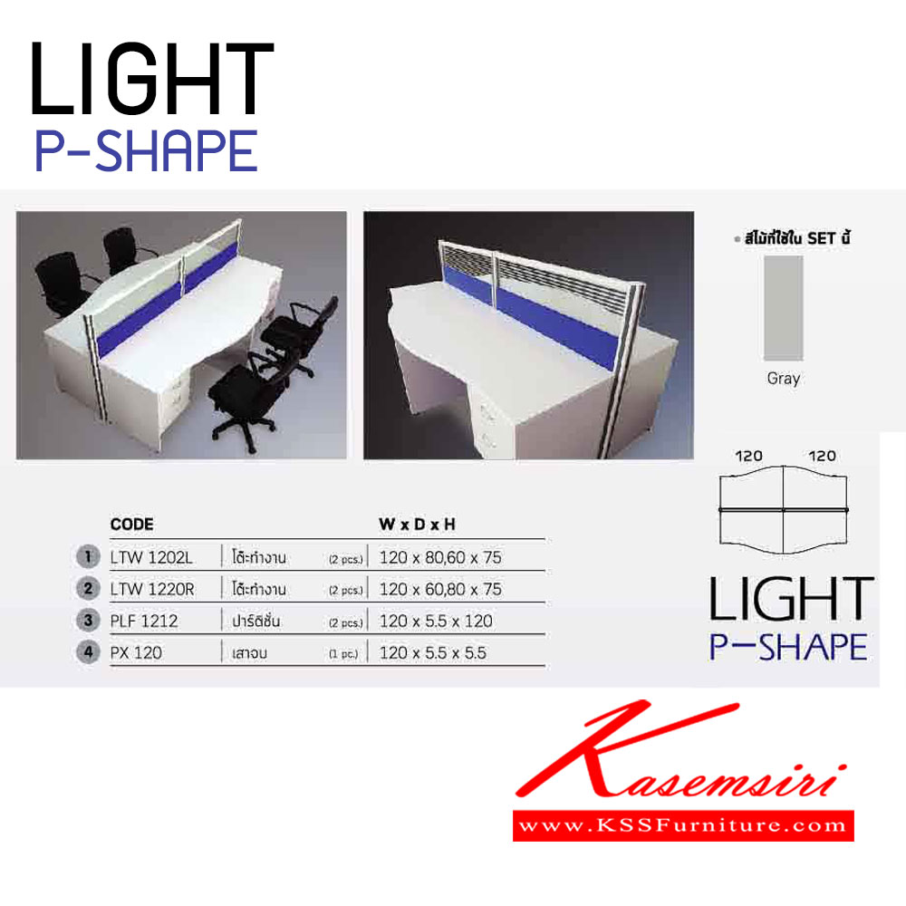 (2)โต๊ะทำงานLTW1202L (ตู้ลิ้นชักฝั่งขวา) ก1200xล800(600)xส750มม. (2)โต๊ะทำงานLTW1202R (ตู้ลิ้นชักฝั่งซ้าย) ก1200xล800(600)xส750มม. (2)ปาร์ติชั่น PLF-1212 (ครึ่งทึบครึ่งกระจกพ่นทราย) ก1200xล55xส1200มม. (1)เสาจบปาร์ติชั่น PX-120 ก55xล55xส1200มม.