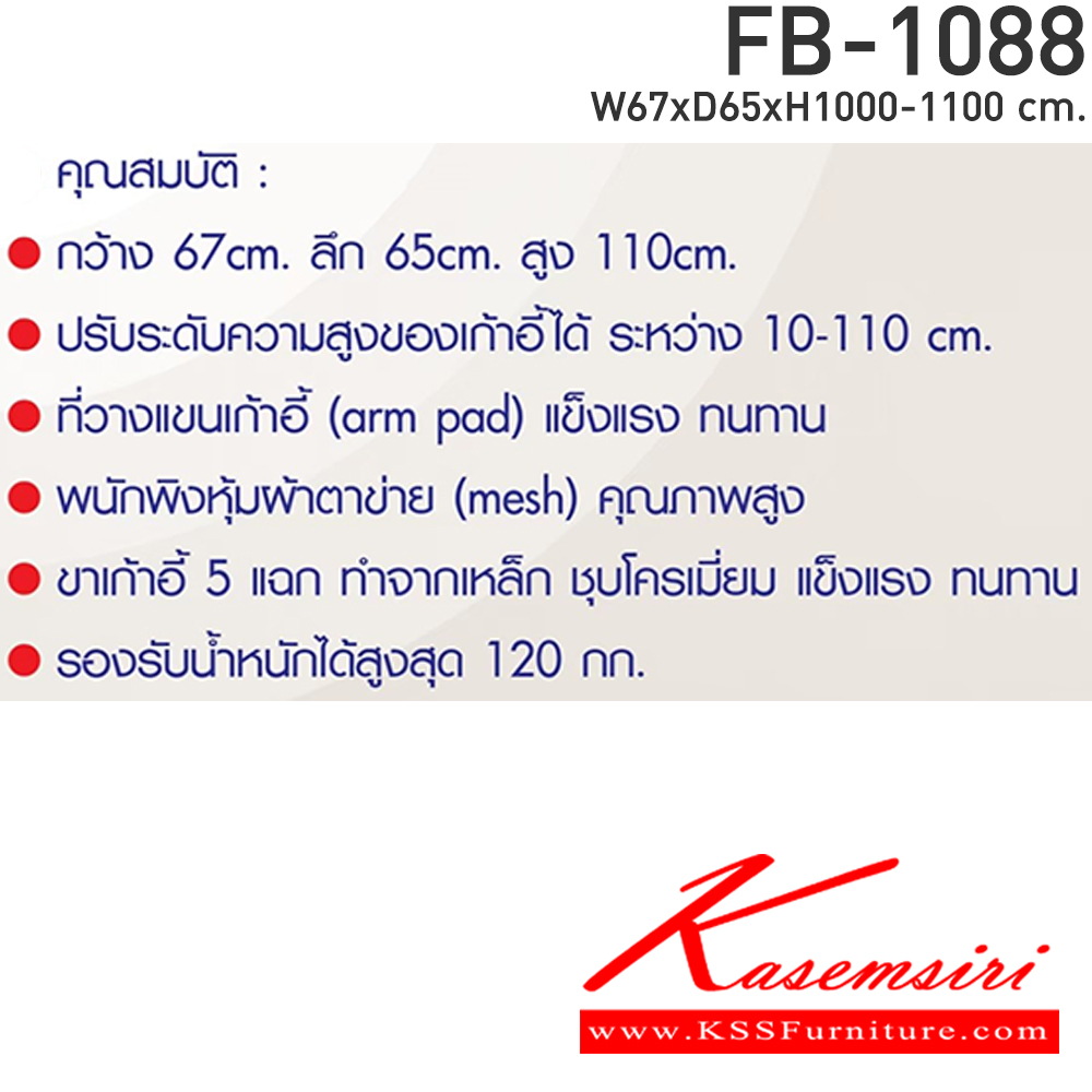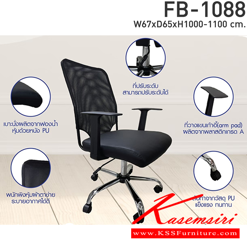 เก้าอี้สำนักงาน รุ่น FB-1088 สีดำ เบาะนั่งบุด้วยฟองน้ำ เพื่อความนุ่มนั่งสบาย พนักพิงหลังหุ้มด้วยผ้าตาข่ายเกรดสูง ขาเหล็กชุบโครเมี่ยมอย่างดี สามารถปรับระดับสูงต่ำได้ ขนาด ก670xล650xส1000-1100 มม. CL เก้าอี้สำนักงาน