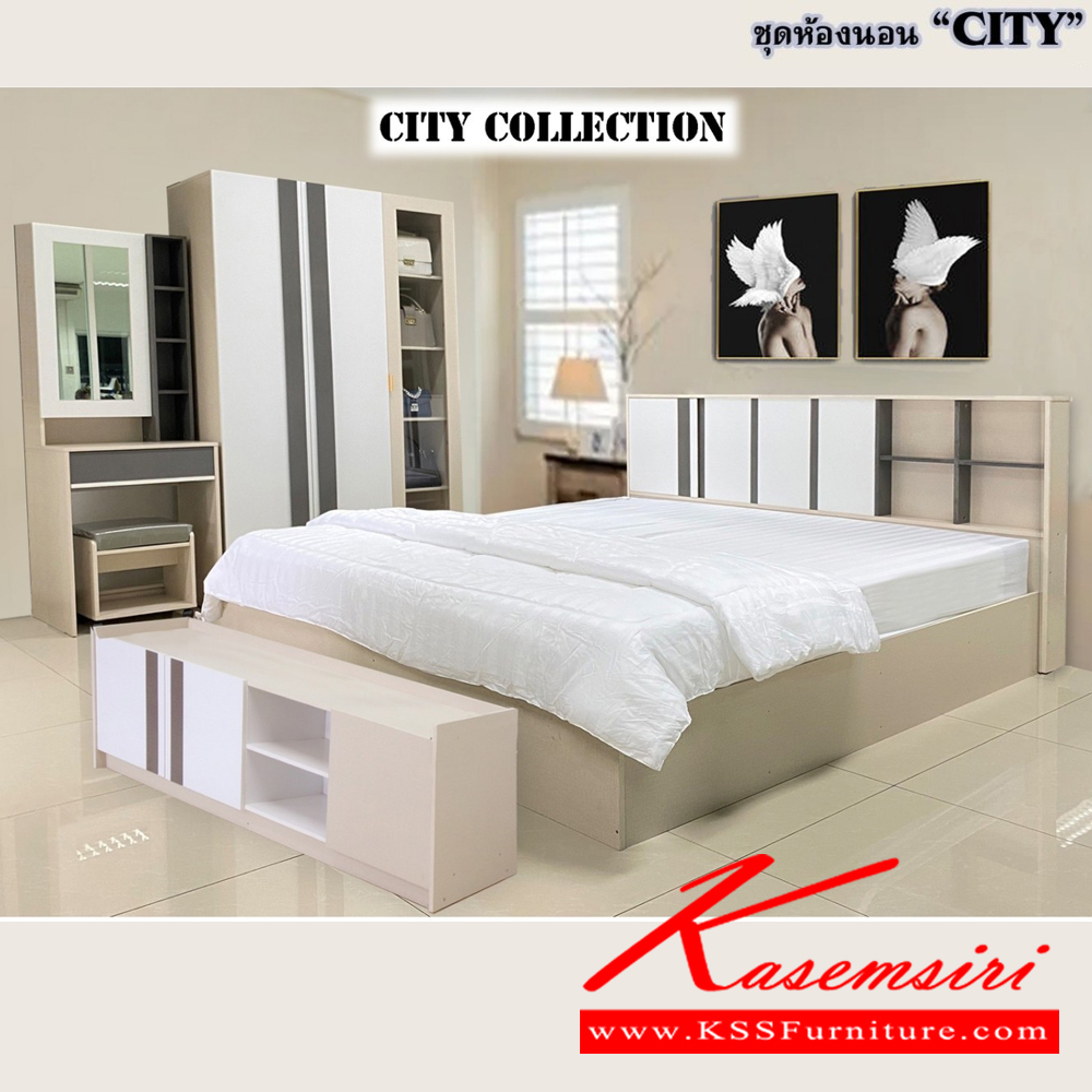 ชุดห้องนอนประกอบด้วย B-3.5/5/6 CITY เตียงนอน 3.5/5/6 ฟุต D-120 CITY ตู้เสื้อผ้า ขนาด 1200x510x2000 มม. DT-60 CITY โต๊ะเครื่องแป้ง ขนาด 600x400x1730 มม. ตู้วางทีวี TV CITY ขนาด 1600x400x570 มม. ดีดี ชุดห้องนอน