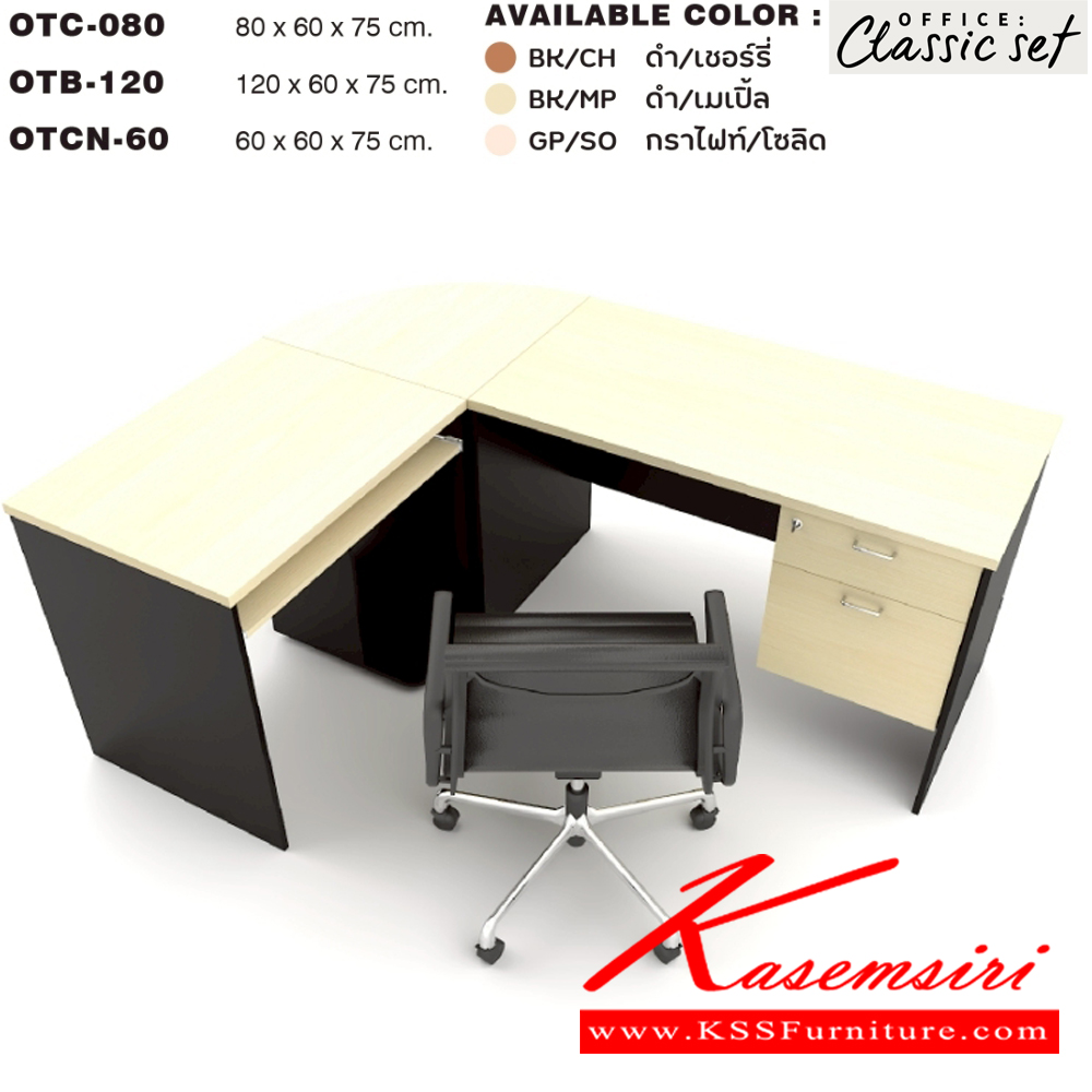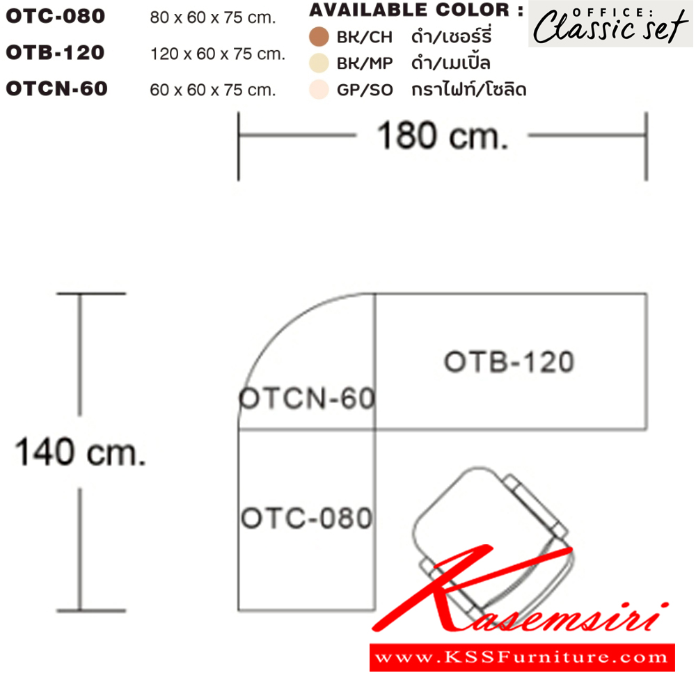 ชุดโต๊ะทำงาน ประกอบด้วย OTC-080 โต๊ะคอมพิวเตอร์80ซม.CPU ขนาด 800x600x750 มม.,OTC-120 โต๊ะทำงาน 120 ซม.2ลิ้นชัก ขนาด 1200x600x750 มม.OTCN-60 โต๊ะเข้ามุม ขนาด 600x600x750 มม. SPEC:PU/MALAMINE สีดำเมเปิ้ล(BKMP),สีดำเชอร์รี่(BKCH),สีกราไฟท์โซลิด TOPหนา25มม