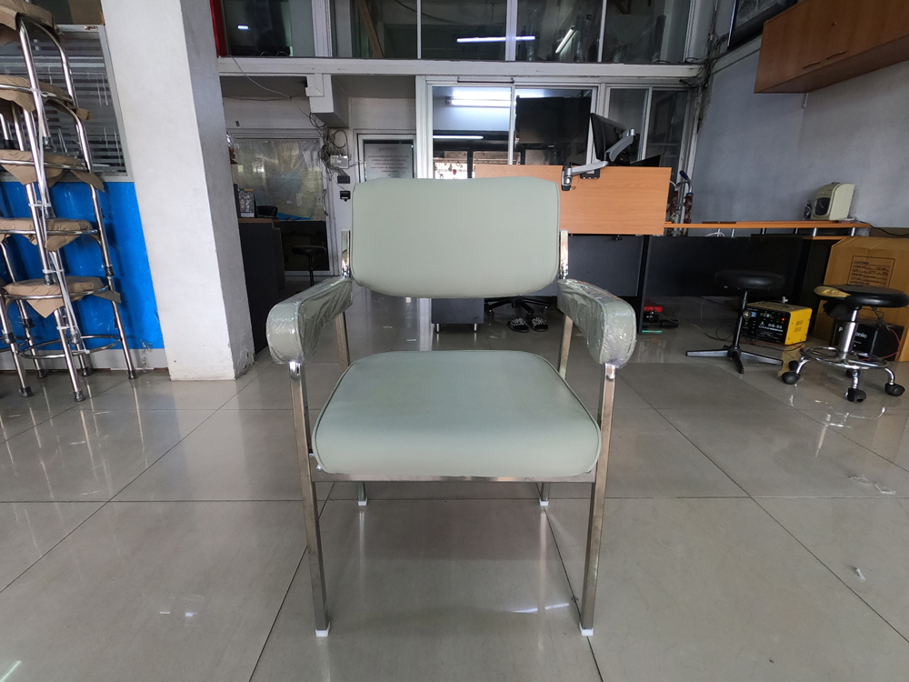 A NAT row chair with armrest, PVC leather seat and chrome plated base. Dimension (WxDxH) cm : 53.5x61x80