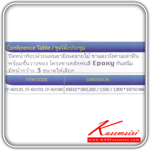 ชุดโต๊ะประชุม รุ่น CF-60120,CF60150,CF60180 มี 3 ขนาดให้เลือก ปิดหน้าท็อปด้วยลามิเนตลายไม้ ขาและบังตาเมลามินพร้อมชั้นวางของ โครงขาเหล็กพ่นสีกันสนิม โต๊ะประชุม โตไก