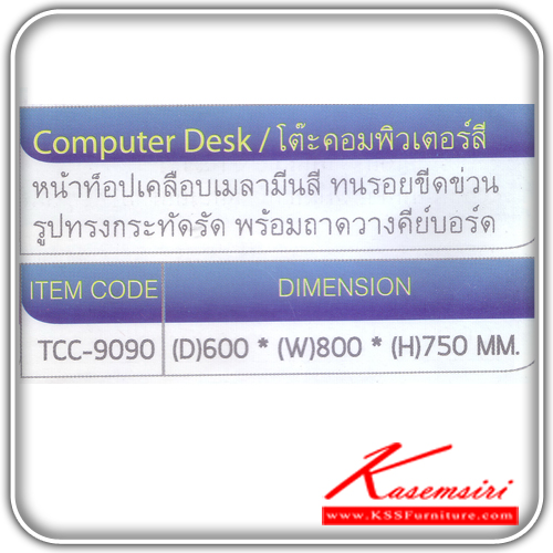 โต๊ะคอมพิวเตอร์สี รุ่น TCC-9090 ขนาด (D)600x(W)800x(H)750MM. หน้าท็อปเคลือบเมลามีนสี ทนรอยขีดข่วนรูปทรงกระทัดรัด พร้อมถาดวางคีย์บอร์ด โต๊ะเหล็ก โตไก