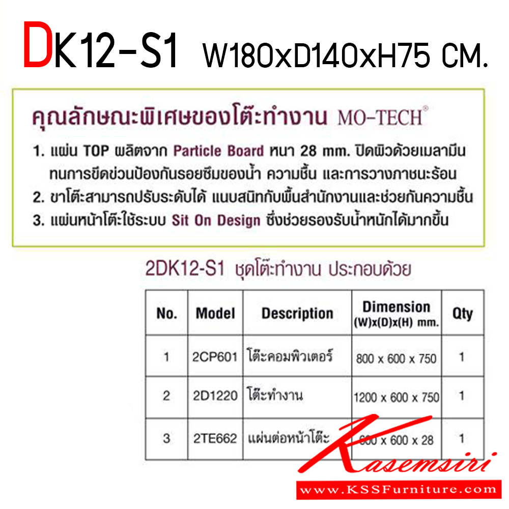 ชุดโต๊ะทำงาน DK12-S1 ประกอบด้วย 1. โต๊ะทำงาน 2D1202 ขนาด ก1200xล600xส750 มม. 2. แผ่นเข้ามุม 2TE662 ขนาด ก600xล600xส750 มม. 3. โต๊ะคอมพิเตอร์ 2CP601 ขนาด ก800xล600xส750 มม. มีให้เลือก 2 สี สี MJ4 (Magio Strip)และ สี EJ5 (Euroline Grey) ชุดโต๊ะทำงาน โม-เทค
