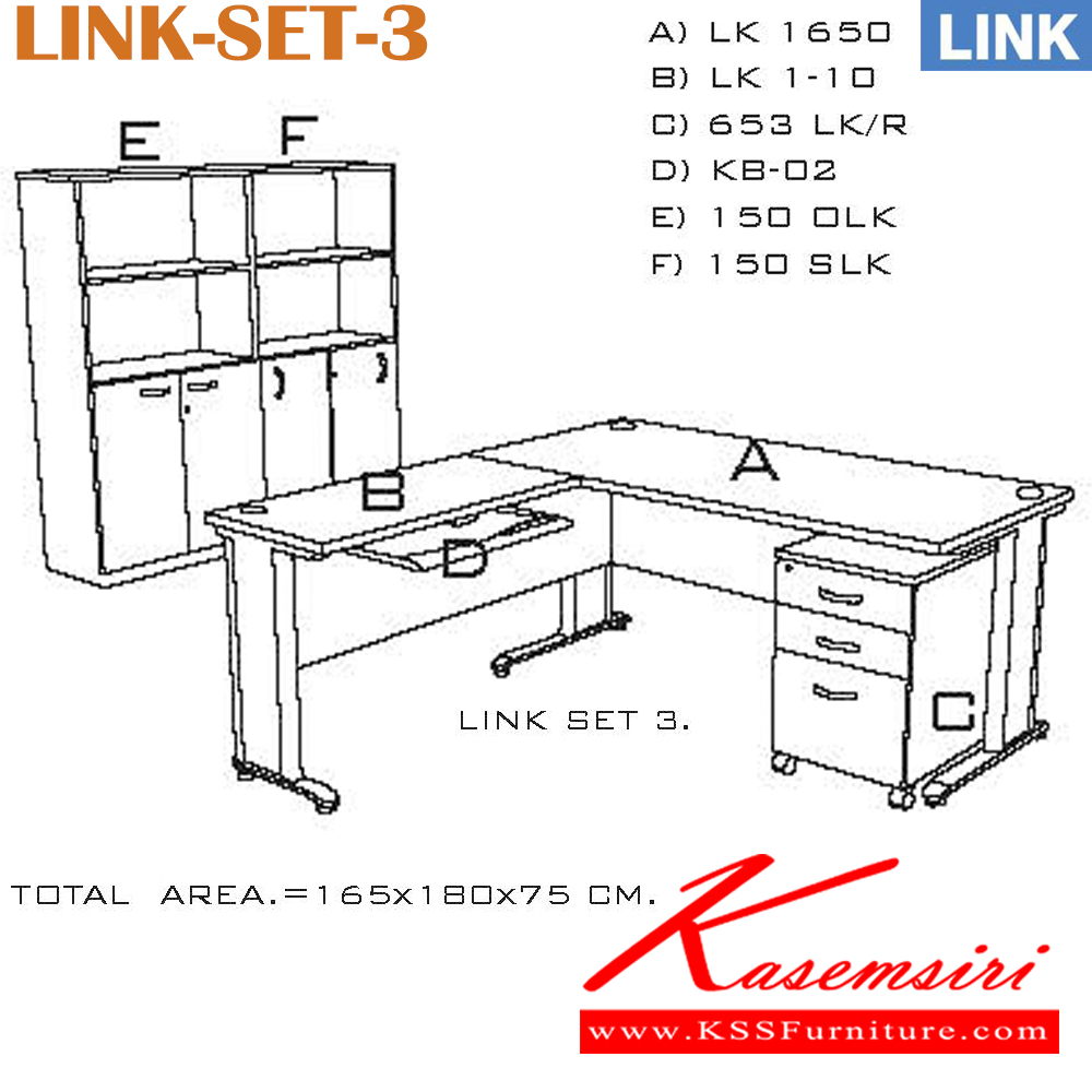 โต๊ะทำงาน LK-1650 ขนาด ก1650xล800xส750มม. โต๊ะต่อข้าง LK-1-10 ขนาด ก1000xล480xส750มม. ตู้ลิ้นชัก 653-LK-R ขนาด ก420xล600xส650มม. คีย์บอร์ด KB-02 ขนาด ก600xล370xส90มม. ตู้เอกสารสูง 150-OLK ขนาด ก800xล400xส1560มม. ตู้เอกสารสูง 150-SLK ขนาด ก800xล400xส1560มม