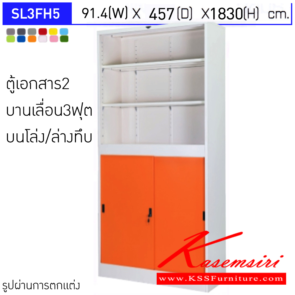 ตู้เอกสารเหล็ก 2 บานเลื่อน บนโล่ง/ล่างทึบ ขนาด 3 ฟุต ขนาดโดยรวม (กxลxส) 914x457x1830มม. มีสีมาตรฐาน และสีสันพิเศษอื่นๆ อีลิแกนต์ ตู้เอกสารเหล็ก