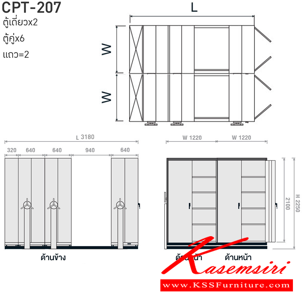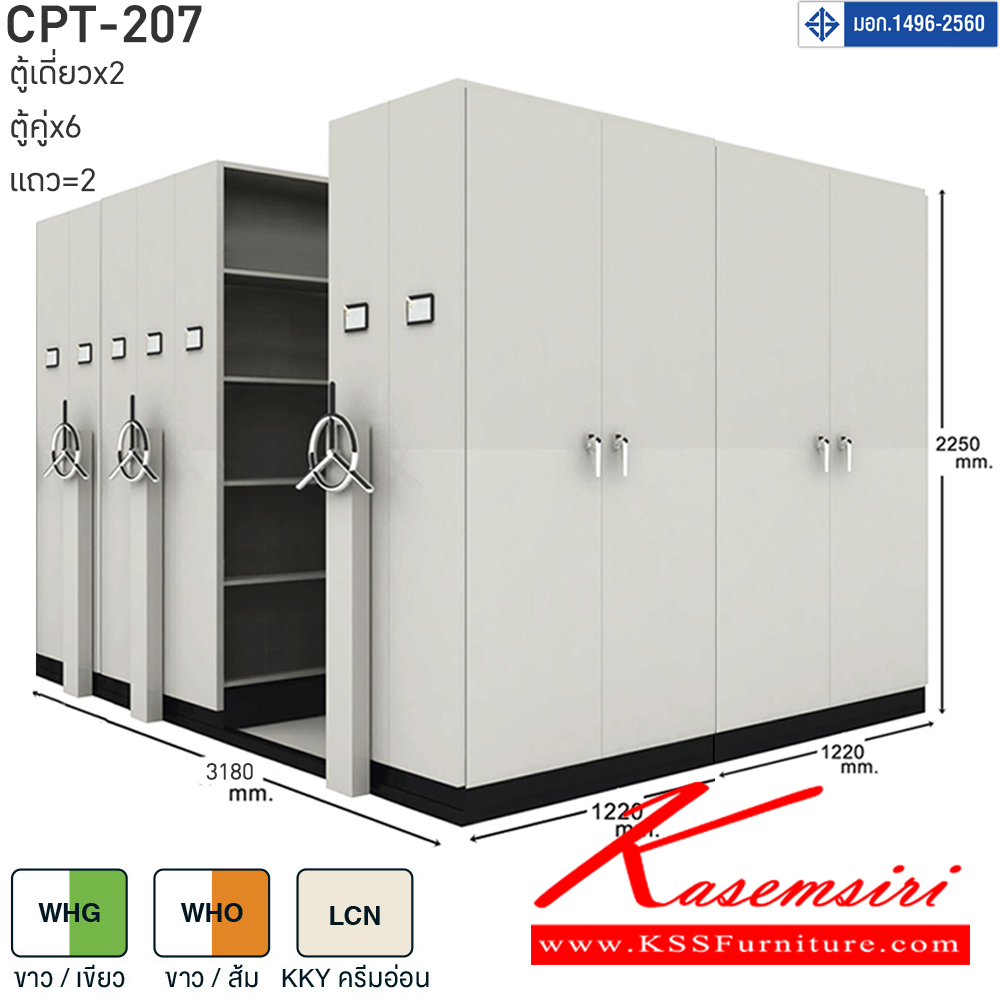 ตู้เอกสารรางเลื่อนมือจับพวงมาลัยหมุน สามารถรับน้ำหนักได้สูง 75 กก./ชั้น โครงสร้างตู้แผ่นเหล็ก SPCC หนา 0.7 มม. รุ่น CPT-207 ประกอบด้วยตู้รางเลื่อนเดี่ยว 2 ตู้ ตู้รางเลื่อนคู่ 6 ตู้ 2 แถว ขนาด กว้าง3180Xลึง2440Xสูง2250 มม.มี 3 สี เขียวขาว,ส้มขาว,ครีมอ่อน