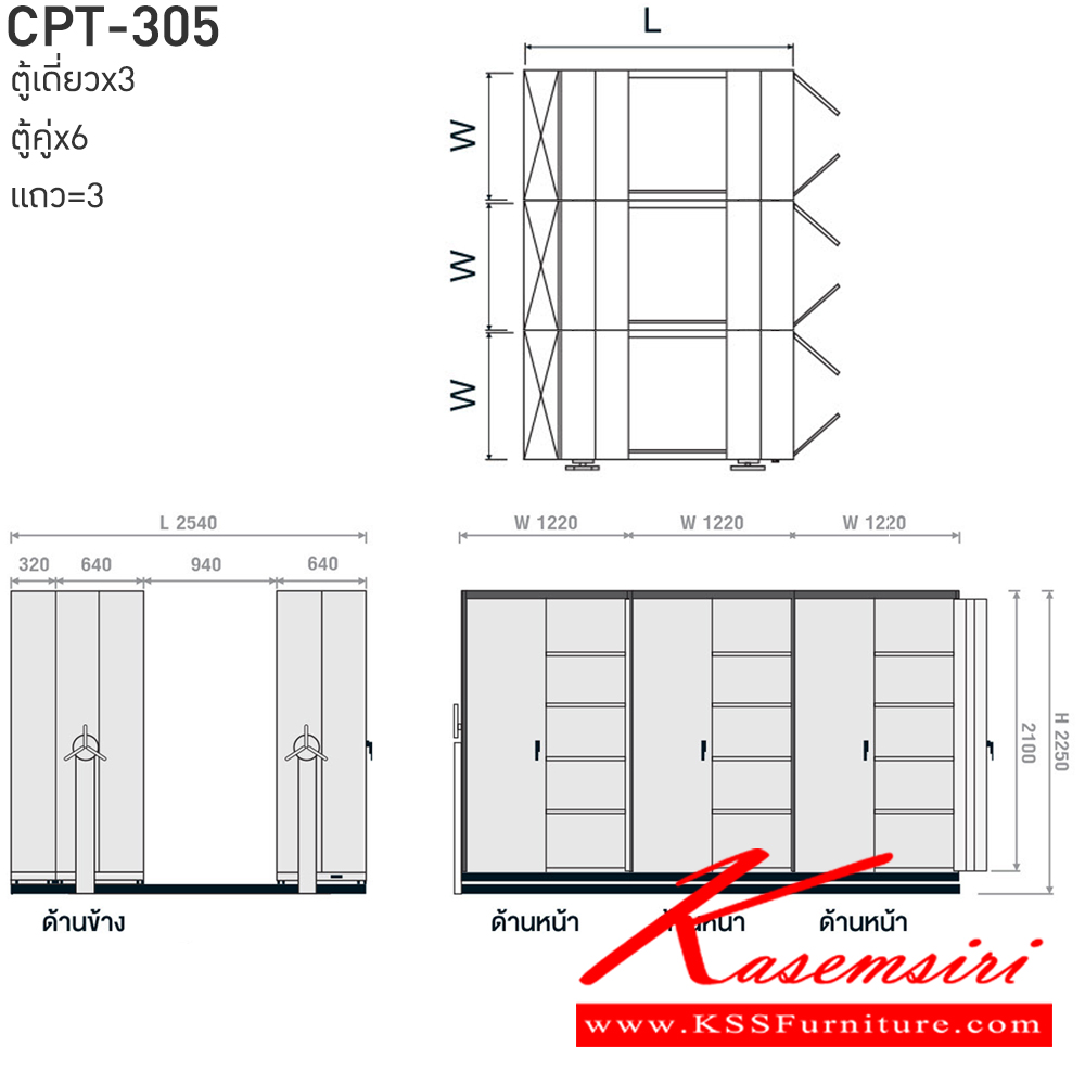ตู้เอกสารรางเลื่อนมือจับพวงมาลัยหมุน สามารถรับน้ำหนักได้สูง 75 กก./ชั้น โครงสร้างตู้แผ่นเหล็ก SPCC หนา 0.7 มม. รุ่น CPT-305 ประกอบด้วยตู้รางเลื่อนเดี่ยว 3 ตู้ ตู้รางเลื่อนคู่ 6 ตู้ 3 แถว ขนาด กว้าง2540Xลึง3660Xสูง2250 มม.มี 3 สี เขียวขาว,ส้มขาว,ครีมอ่อน