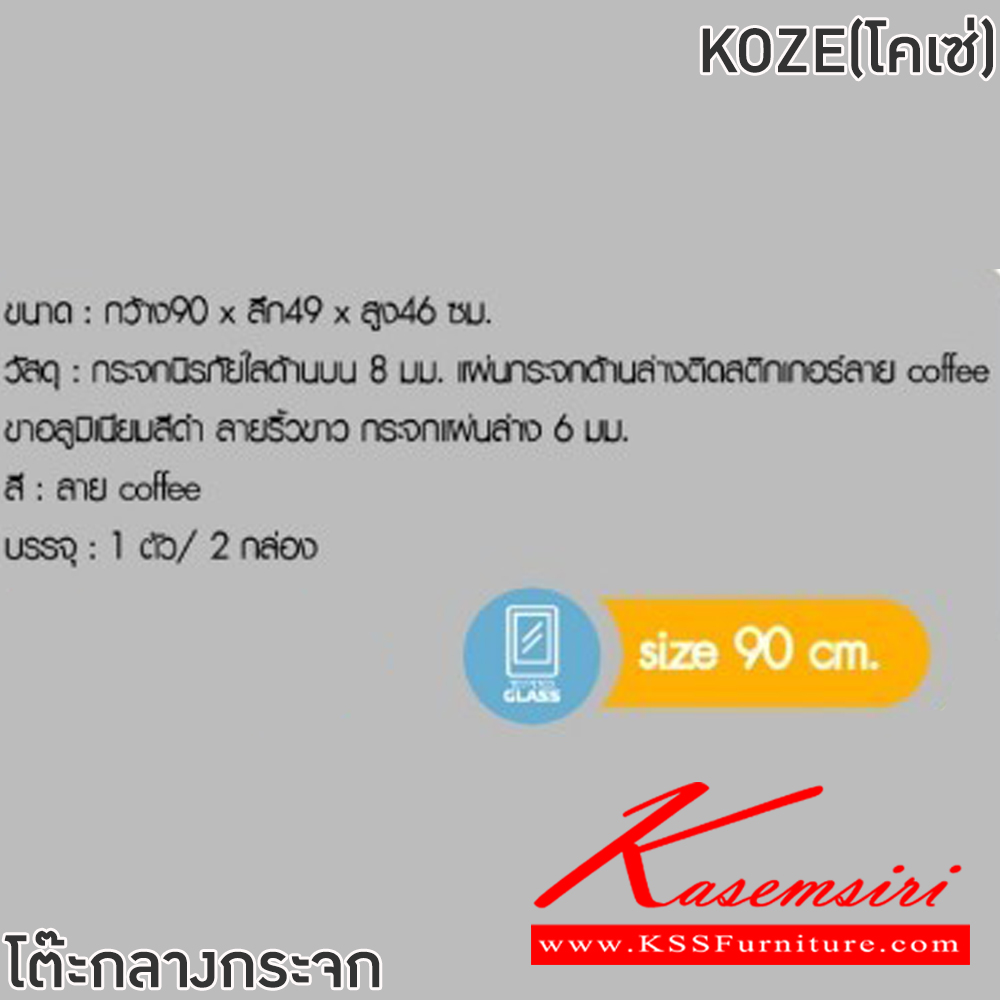 โต๊ะกลางโซฟา KOZE(โคเซ่ )ขนาด ก900xล490xส460 มม. กระจกนิรภัยใสด้านบน 8 มม. แผ่นกระจกด้านล่างติดสติกเกอร์ลาย coffee ขาอลูมิเนียมสีดำ ลายริ้วขาว กระจกแผ่นล่าง 6 มม.