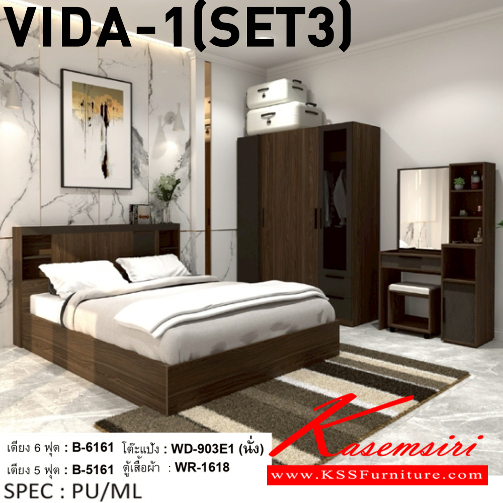 ชุดห้องนอน VIDA1(3ชิ้น) ประกอบด้วย โต๊ะแป้งนั่ง WD-903E1,เตียง5ฟุต B-5161 หรือ เตียง6ฟุต B-6161 ,ตู้เสื้อผ้าWR-1618 SPEC: PU/MELAMINE สีไวท์โอ๊คเทา(WoGy),สีมอคค่าซิลค์(McSk) เอ็กซ์ซีเอฟ ชุดห้องนอน