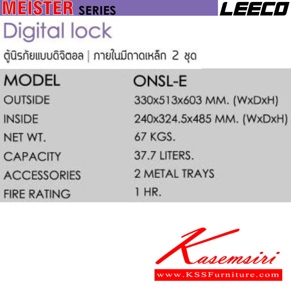 ตู้นิรภัยแบบดิจิตอล น้ำหนัก 67 kg ขนาดภายนอก 330x513x603 มม. ขนาดภายใน 240x324.5x485 มม. ความจุ37.7ลิตร ทนไฟได้1hr ภายในมีถามเหล็ก2ชุด ลีโก้ ตู้เซฟ