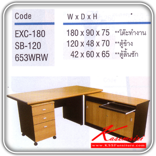 ชุดโต๊ะทำงาน รุ่น EXC. ประกอบด้วย โต๊ะทำงาน EXC-180 ขนาด ก1800xล900xส750 มม. ตู้ข้าง SB-120 2 บานเลื่อน มีที่วางคีย์บอร์ด ขนาด ก1200xล480xส700 มม. ตู้ลิ้นชัก 653WRW 3 ลิ้นชัก มีล้อเลื่อน ขนาด ก420xล600xส650 มม. ชุดโต๊ะทำงาน ITOKI